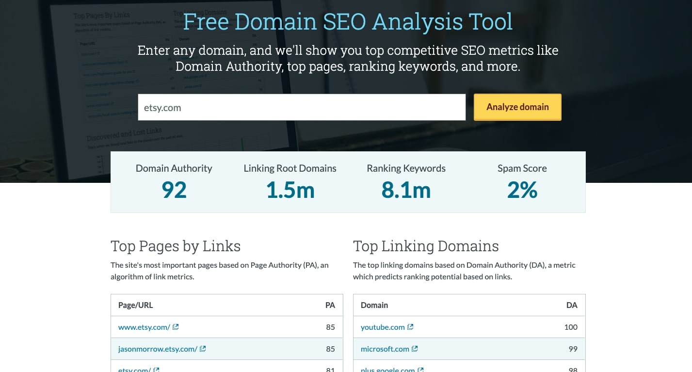 Entrez simplement n’importe quel site Web, cliquez sur « Analyser le domaine », et Moz vous fournira son score DA, le nombre de domaines racine de liaison, le nombre total de mots-clés de classement ainsi que le score de spam.